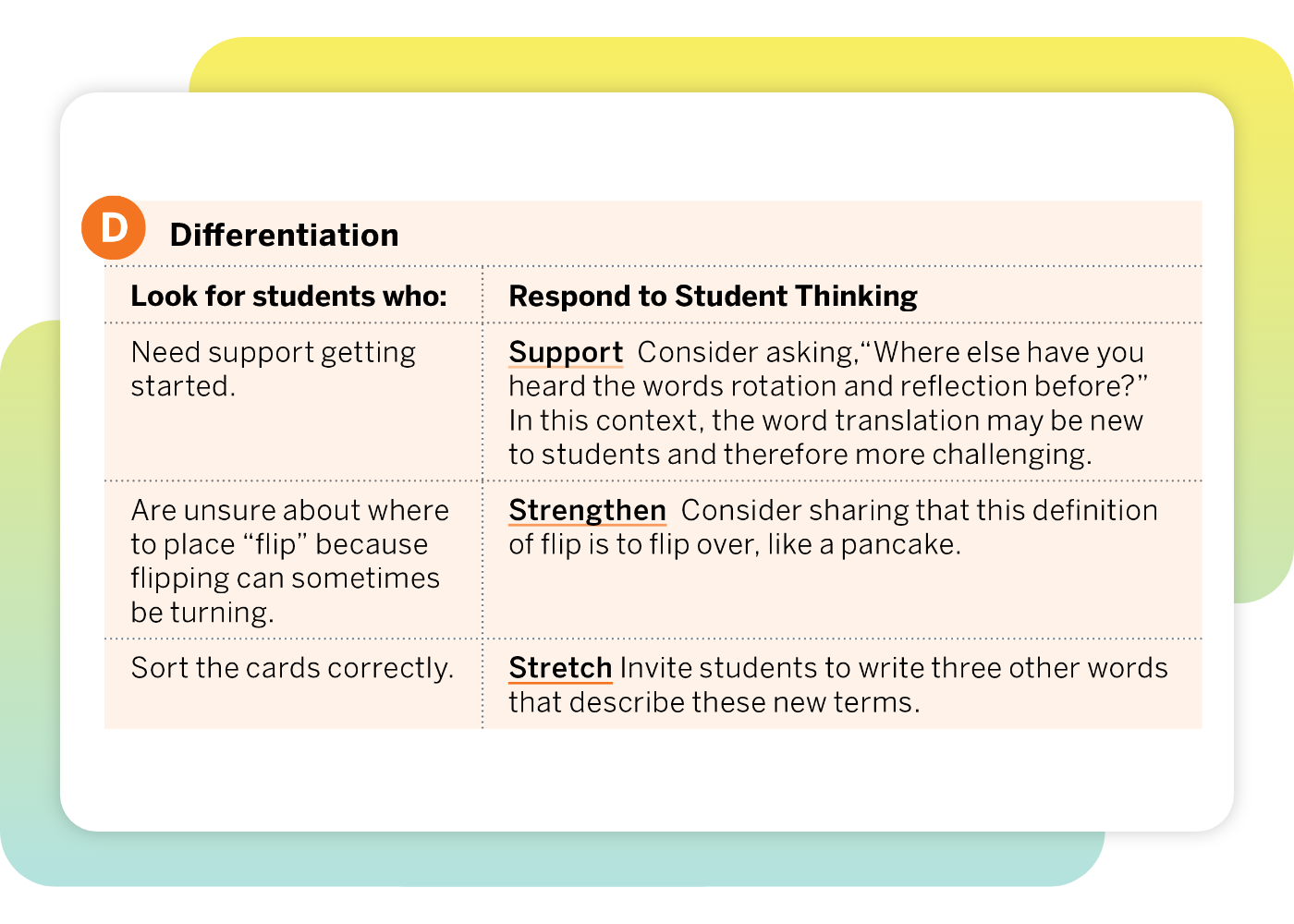 Teachers are provided with clear student actions and understanding to look for, each matched with immediately usable suggestions for how to respond to the student thinking illustrated in each row of the table. In addition to using these suggestions in the moment as teachers monitor student work, teachers can review the Differentiation table in advance to help them anticipate how students are likely to approach the activity.
