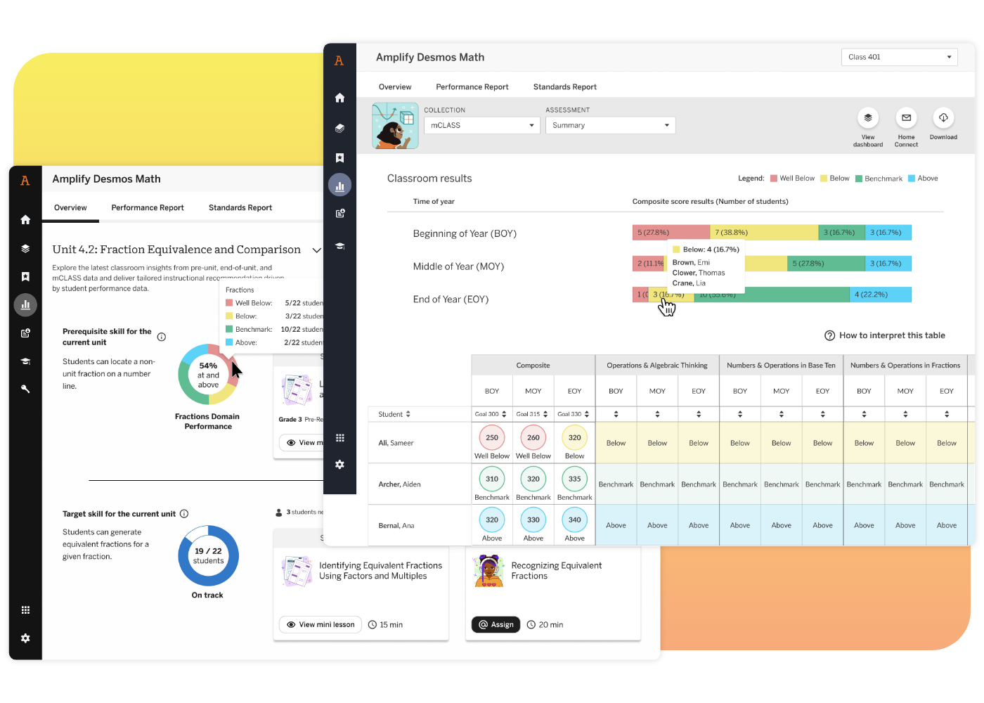 Amplify Desmos Math Texas Reporting provides teachers and administrators with unified data insights so that educators have visibility into what students know about grade-level math. Areas of potential student need are highlighted to allow teachers to modify their instruction and target differentiated support. With actionable insights from mCLASS® Benchmark and Progress Monitoring Assessments, teachers are given recommendations they need to inform Tier 2 and Tier 3 intervention.